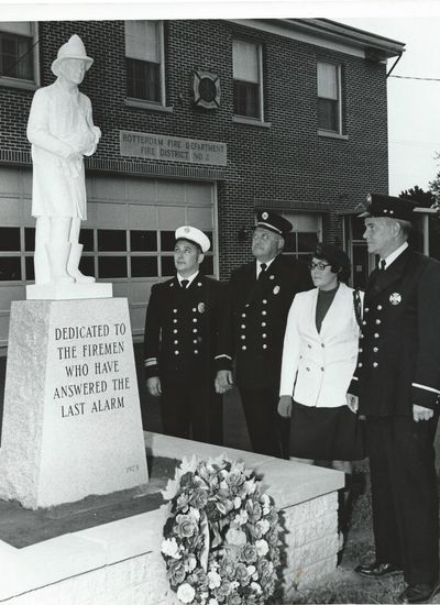Dedicated in 1973, our memorial pays tribute to all Rotterdam Fire District #2 firefighters who have passed away. The memorial reads, "Dedicated to the firemen who have answered the last alarm." This memorial is just a small token of our gratitude to departed RFD#2 firefighters, and serves as a way to remember their legacy. As seen in the images above, if there is a black cape present on the memorial, that is the somber sign that a RFD#2 member (past or present) has passed away.